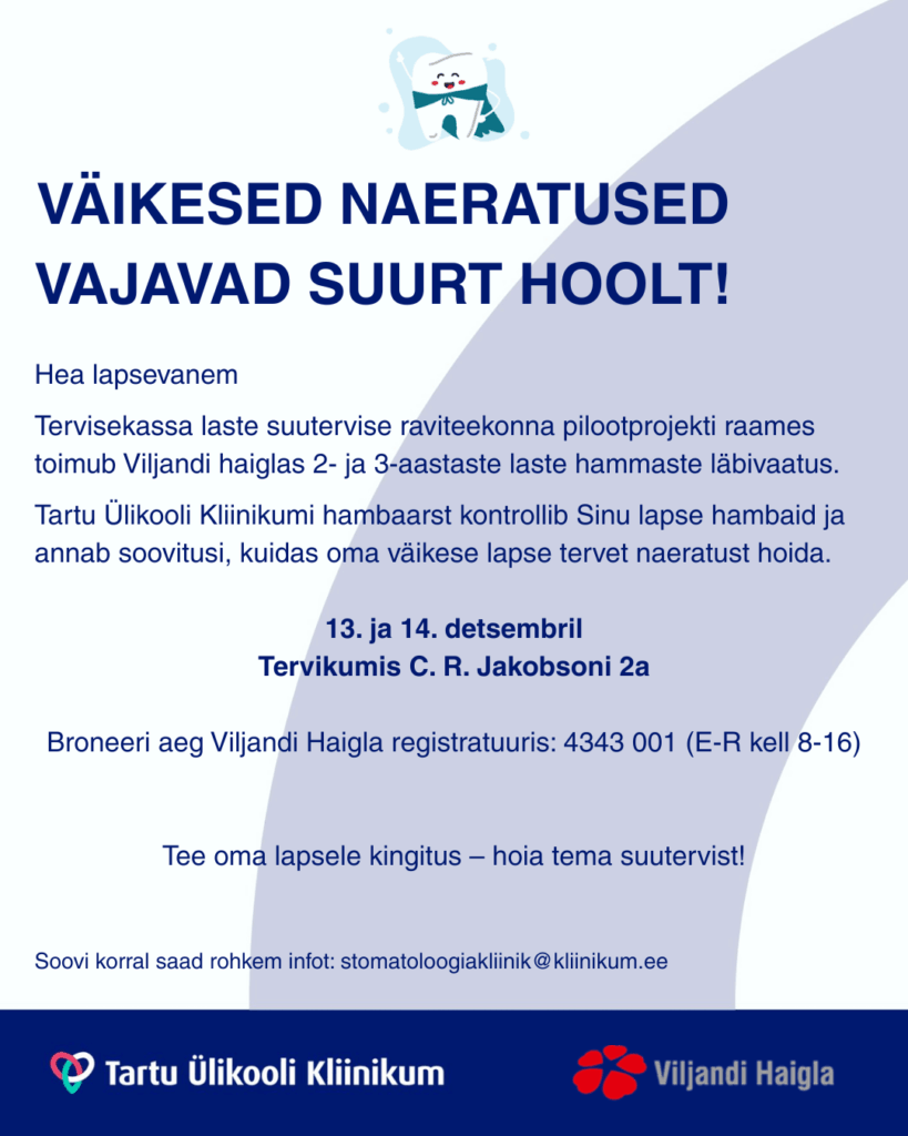 Tervisekassa laste suutervise raviteekonna pilootprojekti raames toimub Viljandi Haiglas 2- ja 3-aastaste laste hammaste läbivaatus.
