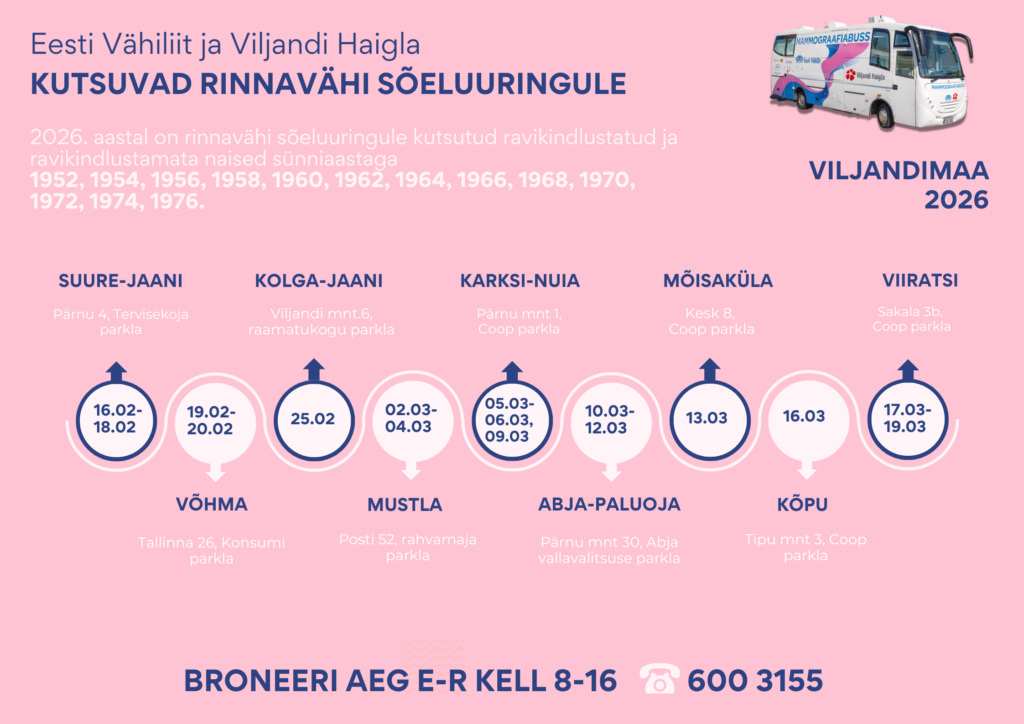 Aasta alguses sõidab meie mammograafiabuss taas mööda Viljandimaad ning peatub mitmes erinevas paigas.