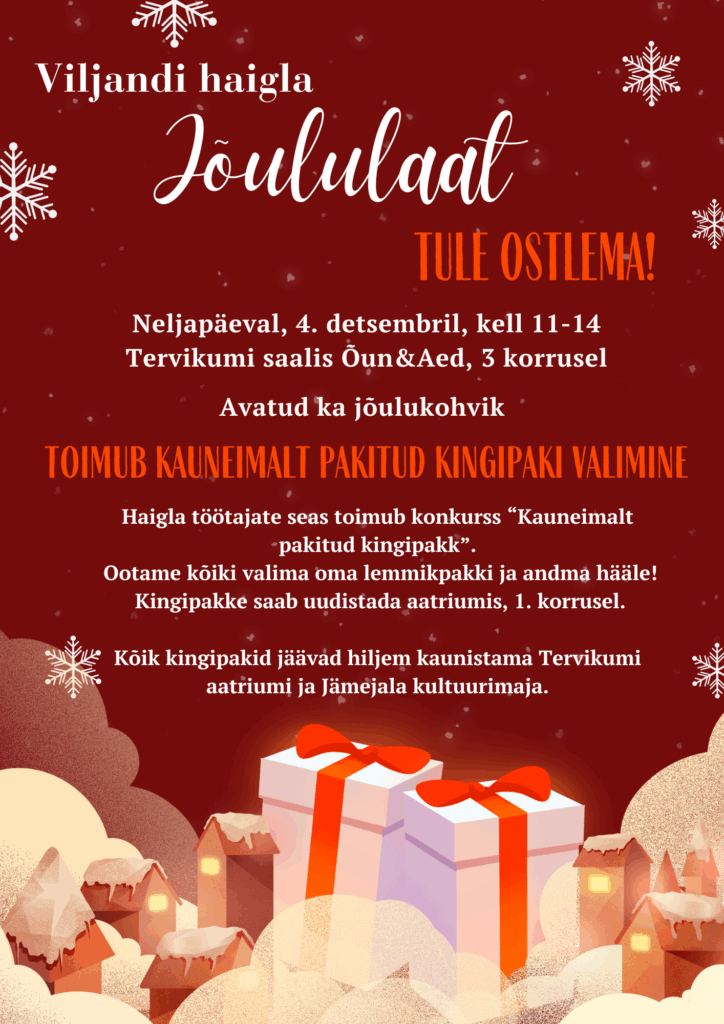 Viljandi haigla jõululaat – neljapäeval, 4. detsembril kell 11.00–14.00 Tervikumi 3. korruse saalis.
