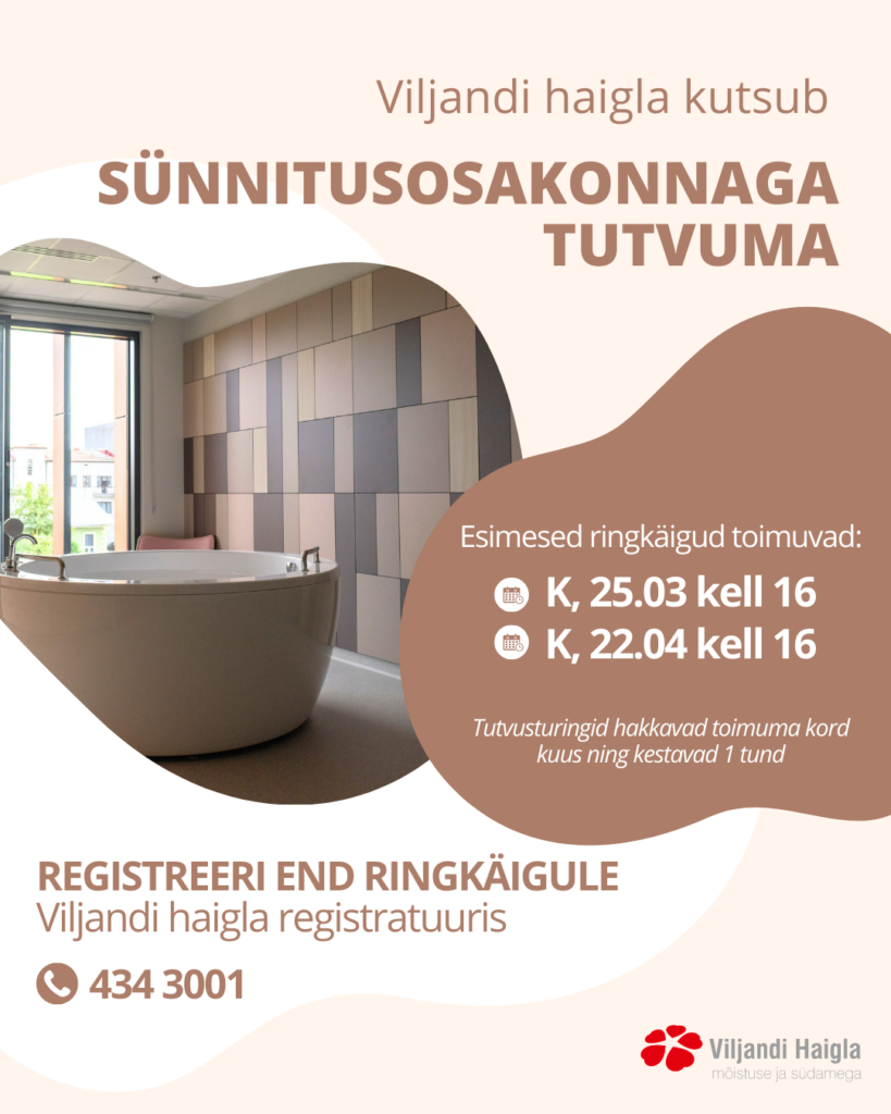 Tutvustusringi viib läbi Viljandi haigla naistekliiniku ämmaemandusjuht Kätlin Mark. „Ootame kõiki huvilisi meie Tervikumis asuva sünnitusosakonnaga tutvuma. Ringkäigu jooksul saab ülevaate Viljandi haigla sünnitusosakonna tööst, ruumidest ning võimalustest, mis on peredele beebiootuse ajal, sünnituse juures ja pärast lapse sündi loodud. Ringkäik annab hea võimaluse tutvuda meie osakonnaga, et sünnitama tulek oleks mugavam ja kodusem,“ kirjeldas Mark.