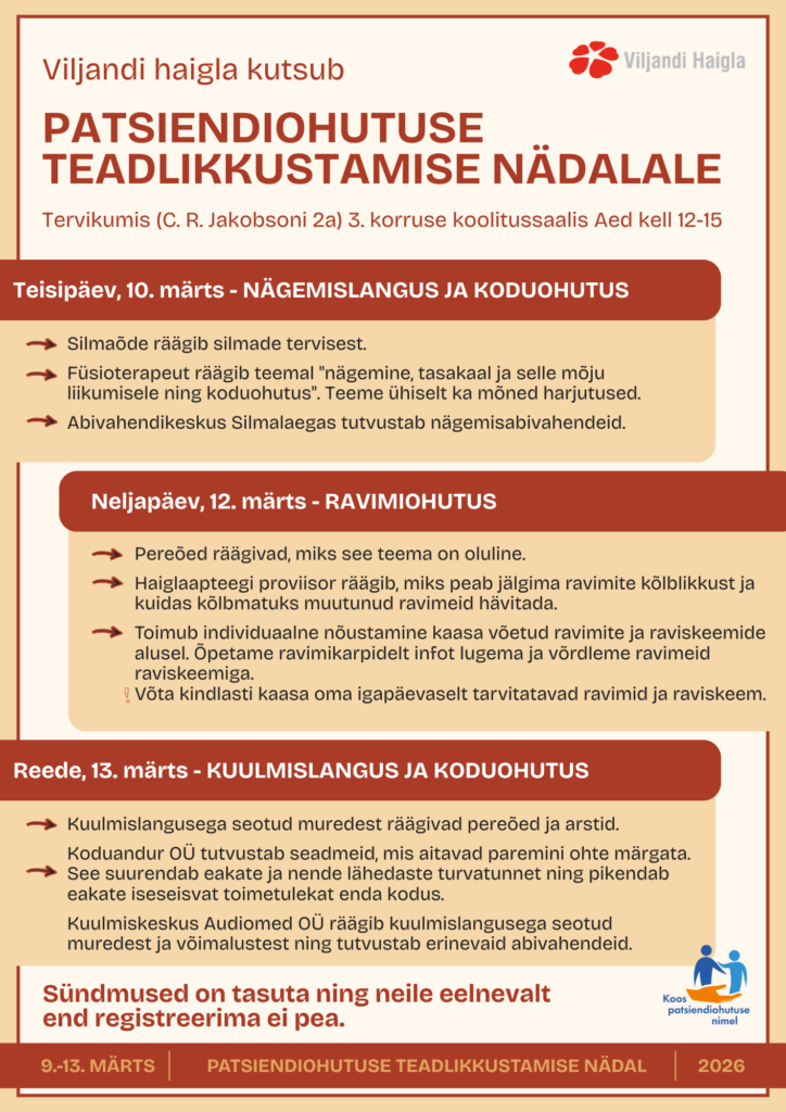 9.-13. märtsil tähistatakse rahvusvaheliselt patsiendiohutuse teadlikkustamise nädalat. Selle raames toimuvad Viljandi haiglas nädala jooksul erinevad tegevused nii patsientidele, lähedastele kui ka tervishoiutöötajatele. Viljandi haigla kutsub kõiki huvilisi praktilistesse töötubadesse, mille fookuses on inimeste igapäevast toimetulekut ning kodust turvalisust puudutavad teemad – nägemine, kuulmine ja ravimite ohutu kasutamine.